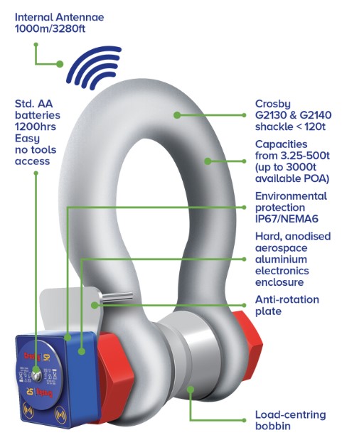 Straightpoint´s Wireless Loadshackle (WLS) provides the perfect solution to limited headroom or super heavy lift projects. Available from stock in capacities from 3.25t to 500t (up to 3000t available POA), the WLS is constructed using industry-leading shackles from Crosby.