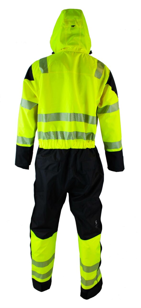 Allir saumar límdir að innanverðu. Rennilás á skálmum, upp í mitti. Með axlaböndum. Hnépúðavasar. Flís í kraga. Þéttar ermalíningar með þumalgötum. Aftakanleg hetta.
