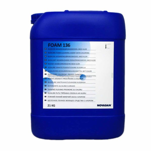 | 28586 | Foam 136 kvoðusápa m/klór 21 kg. | Foam 136 er afar öflugt alkalísk kvoðusápa með klór (klórkvoðusápa). Foam 136 er mikið tekið til þrifa í matvæla- og fiskvinnslum og verslunum, sápan vinnur mjög vel á erfiðum óhreinindum svo sem fitu, prótín, sterkju o.fl. sápan verður þykk og loðir vel við lóðrétta fleti |