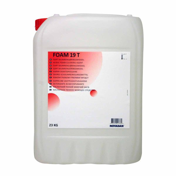 | 29812 | Foam 19 T Sýruvask 20 lítrar | Foam 19 T er afar öflug súr kvoðusápa einnig kallað sýruvask. Sápan var hönnuð fyrir matvæla- sem og lyfjaiðnað. Foam 19 T hentar gríðarlega vel til þess að hreinsa fitu, prótein, blóð o.fl., hreinsar einnig ryðtauma. Myndar góða kvoðu sem heldur sér vel þegar hún er notuð í kvoðutæki. Foam 19 T má nota á ál en þó er best að prófa á lítt sjáanlegum stað til að byrja með. |