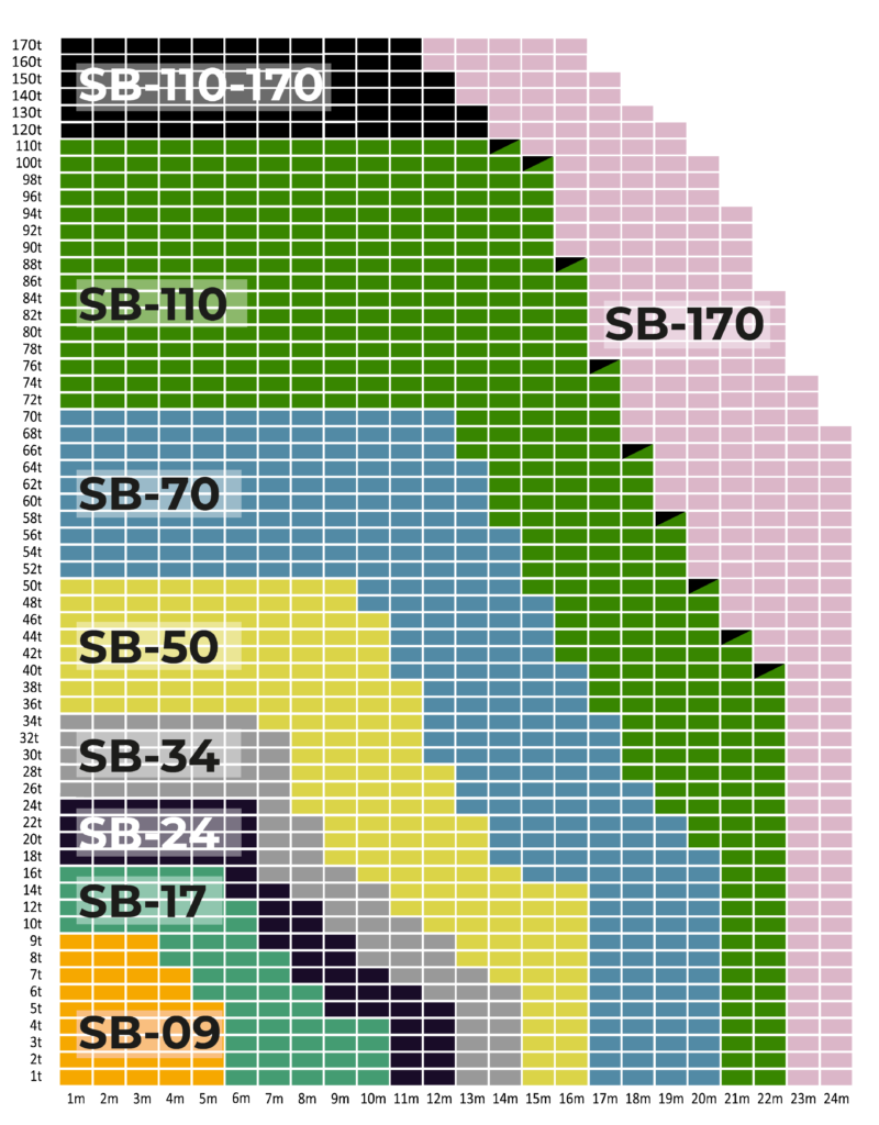 Taflan hér fyrir neðan sýnir leyfilegt vinnuálag að 30° og max 170 tonna þyngd og hvaða hífibitar henta hverju sinni. Ef hífa á meiri þyngdir þá eru sölumenn okkar tilbúnir að hjálpa við að finna hvaða bitar henta hverju verkefni fyrir sig