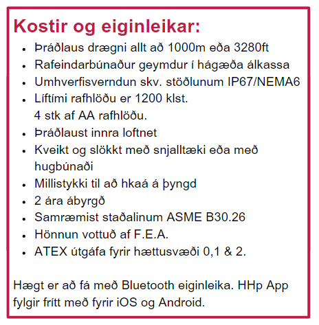 - Bluetooth tenging þar sem hægt er að tengja við hvaða snjallsíma sem er. Hægt er að nálgast ókeypis HHP app á iOS eða Android, allt að 100m eða 328 ft.