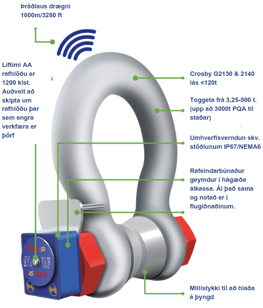 Straightpoint´s Wireless Loadshackle (WLS) veitir fullkomna lausn fyrir takmarkað rými eða fyrir verulega þung lyftiverkefni. Fáanlegt með toggetu frá 3,25t til 500t (allt að 3000t í boði POA). WLS er smíðað sem iðnaðarlausn sem styðst við lása frá Crosby.