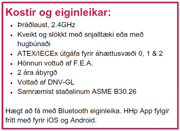 - Bluetooth tenging þar sem hægt er að tengja við hvaða snjallsíma sem er. Hægt er að nálgast ókeypis HHP app á iOS eða Android, allt að 100m eða 328 ft.