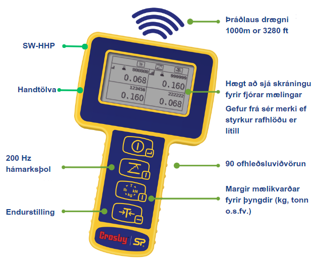 Varan hefur farið í gegnum áratuga þróun og hefur því marga eiginleika sem aðra vörur hafa ekki. Álagsmælingaraðferð SP´s hjálpar til við að bæta upp fyrir togvíra þegar Radiolink er hlaðið. Radiolink plus álagsmælinguna er hægt að nota með þráðlausa hugbúnaðinum, Crosby | Straightpoint ´INSIGHT’. Búnaðurinn gerir aðilum kleift að stjórna, sýna og skrá í rauntíma allt að 126 Crosby | Straightpoint þráðlausar mælingar.