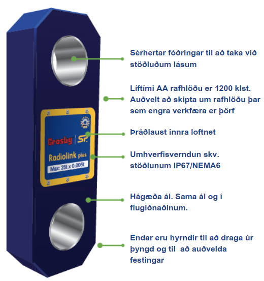 Radiolink plus er hannað til að taka á móti Crosby lásum. Tækið er DNV-GL vottað. Radiolink plus er með þráðlausa álags- og þyngdarmælingu, ásamt því að vera með öfluga hleðsluvögtun frá 1t upp í 500t. ATEX og IECEx útgáfa er til staðar fyrir hættusvæði 0, 1 & 2.