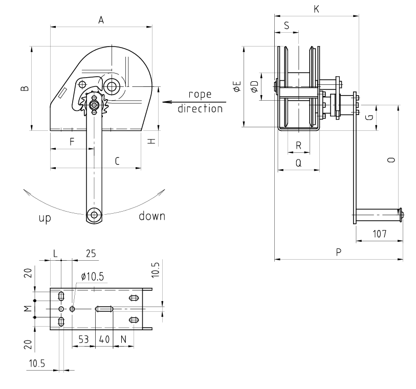 | Vörunr. | Lýsing | Gerð | Álag innst | Álag yst | Tóg ummál | Lengd tóg | Lyfting per snúning | Snúningskraftur | Þyngd án tógs | A (mm) | B (mm) | C (mm) | Q D (mm) | Q E (mm) | F (mm) | G (mm) | H (mm) | K (mm) | L (mm) | M (mm) | N (mm) | O (mm) | P (mm) | Q (mm) | R (mm) | S (mm) |